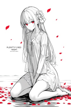(masterpiece),(best quality),illustration,ultra detailed,hdr,Depth of field,(colorful),1girl,red eyes,white long translucent night gown,expressionless,(white hair),hair cover one eye,long hair,red hair flower,kneeling on lake,blood,(plenty of red petals:1.35),(white background:1.5),(English text),greyscale,monochrome,greyscale,monochrome,sketch,