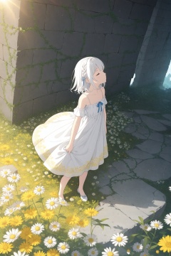 (masterpiece),(best quality),illustration,ultra detailed,hdr,Depth of field,(colorful),loli,yellow theme,the setting sun,Chamomile,Chamomile,cornflower,vines,forest,ruins,lens flare,hdr,Tyndall effect,damp,wet,1girl,bare shoulders,broken glass,broken wall,white hair,white dress,closed mouth,constel lation,flat color,braid,blinking,white robe,float,closed mouth,constel lation,flat color,looking up,standing,medium hair,standing,solo,