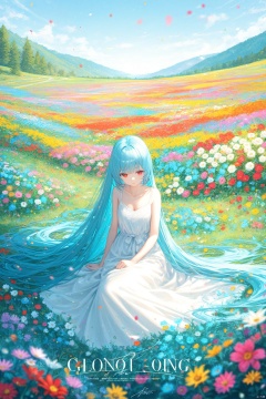 (masterpiece),(best quality),illustration,ultra detailed,hdr,Depth of field,(colorful),(chromatic aberration),(Movie Poster),(signature:1.3),(English text:1.3),1girl,girl middle of flower,pure skyblue hair,red eyes,clear sky,outside,collarbone,sitting,absurdly long hair,clear boundaries of the cloth,white dress,fantastic scenery,ground of flowers,thousand of flowers,colorful flowers,flowers around her,various flowers,