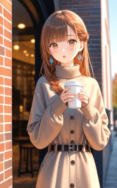 (masterpiece),(best quality),illustration,ultra detailed,hdr,Depth of field,(colorful),1girl,solo,holding,long hair,looking at viewer,cup,bangs,long sleeves,holding cup,brown eyes,brown hair,disposable cup,belt,earrings,blush,jewelry,braid,brick wall,outdoors,capelet,open mouth,:o,sweater,coffee cup,parted lips,bow,turtleneck,standing,sleeves past wrists,hands up,belt buckle,shiny hair,