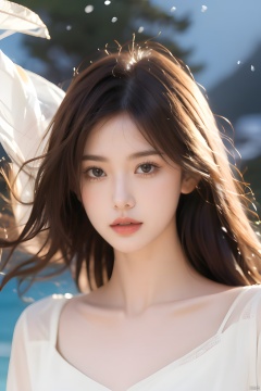 extremely detailed,realistic,1girl,solo,black hair,long hair,Messy hair,black eyes,lips,collarbone,flower,upper body,portrait,dress,close_mouth,looking at viewer,side,beauty,floating petals,blurry background,Split Lighting,deep shadow,cowboy shot,white dress,melancholic expression,Elegant movements,crying,(tears),Low maintenance,snowing,outdoors,at the ocean,,