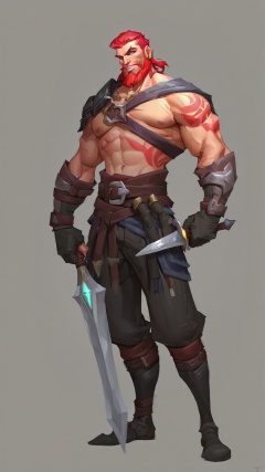 grey background, 1boy, holding, weapon, over shoulder, male focus, solo, weapon over shoulder, holding weapon, facial hair, muscular, pants, sword, simple background, holding sword, gloves, beard, pouch, belt, topless male, abs, muscular male, full body, colored skin, pectorals, teeth, fingerless gloves, boots, standing, collarbone, earrings, glowing, tattoo, red hair, navel, black pants, smile