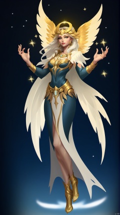 A supernatural angel named female, the appearance shows a mysterious and bright temperament, she wears a gorgeous robe woven by stars and moonlight, every step is like dancing stars and the Milky Way. A halo shines above her head, symbolizing her divine mission and the source of her power. The wings of the female supernatural angel are covered with golden feathers, showing her elegance and mystery, and her eyes are deep and crystal, as if they can see the essence of everything