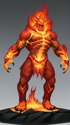 A fire monster called the Burning Beast. The beast was large and covered in blazing fire, with powerful limbs and blazing eyes. Its entire body is covered with a hardened rock shell, as if lava were flowing across the surface. The roar of the scorched beast was deafening like a volcanic eruption, and the ground trembled with every step. The fiery energy emanating from it makes the air around it seem to burn, the embodiment of a fiery fury