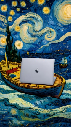 jistarrynight,product photograph,(A MacBook is displayed on a boat),van Gogh,Shooting from a far angle,<lora:jistarrynight V1.0:1>,
