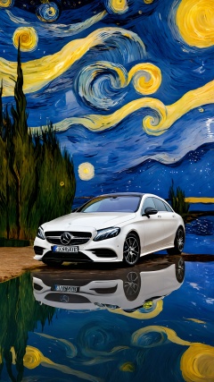 jistarrynight,product photograph,C-class sports cars,automotive product photography,(A Mercedes Benz is displayed on a lake),van Gogh,<lora:jistarrynight V1.0:1>,