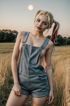 masterpiece,best quality,ultra high res,1girl,harley quinn \(cosplay\),tashan naked overalls,Repetition composition,Vibrant color,Tight Shot,<lora:20240412beidai-v1:0.6>,A moonlit meadow with soft grass and twinkling stars.,
