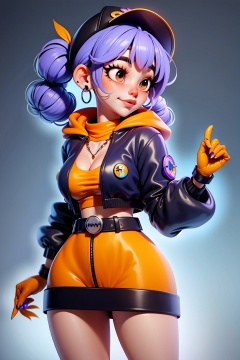 1girl, solo, twintails, jacket, hat, jewelry, mask, earrings, baseball cap, bangs, looking at viewer, v, mouth mask, gloves, orange background, blue nails, nail polish, fingerless gloves, hood, purple hair, upper body, simple background, yellow jacket, ear piercing, piercing, blue hair, belt, yellow background, long sleeves, blunt bangs, hand up, drawstring, hood down, ring, masterpiece,best quality,