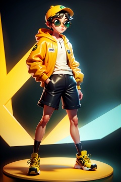 a 3D animated character,a young boy with large expressive eyes,wearing a yellow jacket with a green hoodie underneath. He sports a pair of sunglasses with green lenses,and his outfit is complemented by a white cap. The boy is also seen wearing a pair of black shoes with yellow laces. The background is a vibrant orange,giving a warm and lively feel to the overall composition,, masterpiece,best quality,