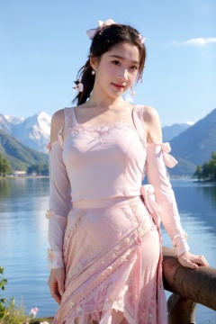 4k, photo, realistic, best quality,highres, ultra-detailed,ultra high res,((photorealistic, 8K)),from above, upper body, (face me),(big breasts:0.8),(beauty **** girl:1.6), (black hair), middle breasts, **** face,twin tails, smile, aqua_eyes, (fair skin), tender skin, big breasts,(pink ribbon around neck:1.5), standing,(owe blue Hanfu lace long skirt:1.2), Under the peach blossom tree, mountains and rivers in the distance,