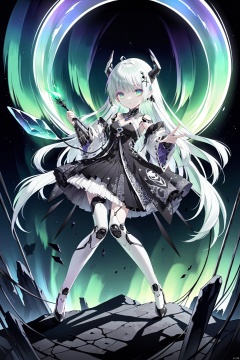, TIANQIJI,1girl,casting spells,detailed face, detailed hand,fantasy,Aurora Borealis,dramatic lighting,shadows,(art by Harry Clarke Hiroshi Yoshida)