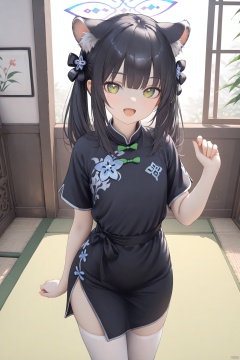 long hair, looking at viewer, blush, smile, open mouth, bangs,(( black hair)), dress, animal ears, twintails, green eyes, short sleeves, :d, hand up, blunt bangs, black dress, animal ear fluff, halo, chinese clothes, china dress, arm behind back, tiger ears, tiger girl, shun \(blue archive\),white thighhigh,hands_behind_back, indoors, tatami,