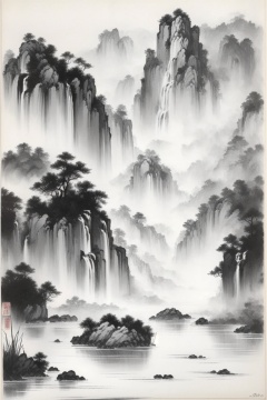 ((HRD, HUD, 8K)),((masterpiece, best quality)), highly detailed, soft light,InkAndWash, monochrome, greyscale, scenery, outdoors, traditional media, <lora:20240415-1713175931242:0.8>