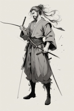 ((HRD, HUD, 8K)),((masterpiece, best quality)), highly detailed, soft light,InkAndWash, weapon, solo, 1boy, male focus, holding, holding weapon, facial hair, monochrome, beard, bow (weapon), long hair, full body, sword, arrow (projectile), long sleeves, torn clothes, standing, japanese clothes, ponytail, arm guards, holding bow (weapon), holding sword, wide sleeves, hakama, closed mouth, sheath, simple background, mustache, <lora:20240415-1713175931242:0.8>