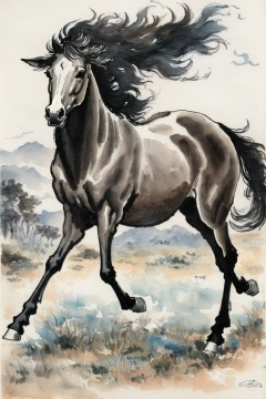 ((HRD, HUD, 8K)),((masterpiece, best quality)), highly detailed, soft light,InkAndWash, no humans, horse, traditional media, painting (medium), full body, signature, watercolor (medium), riding, horseback riding, faux traditional media,  <lora:20240415-1713175931242:0.8>