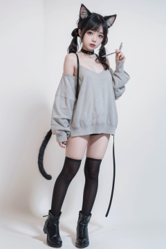 1girl,absurdres,animal_ear_fluff,animal_ears,black_choker,black_hair,cat_ears,cat_girl,cat_tail,choker,(full_body:1.5),highres,red_eyes,shouwang,simple_background,solo,stylus,sweater,tablet_pc,tail,thigh_strap,twintails,white_background,writing,xingye,autoappealing,autoappealingdb,best quality,masterpiece,nai3,, cos,