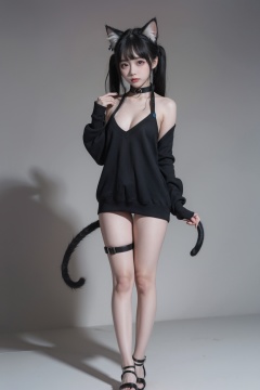 1girl,absurdres,animal_ear_fluff,animal_ears,black_choker,black_hair,cat_ears,cat_girl,cat_tail,choker,(full_body:1.5),highres,red_eyes,shouwang,simple_background,solo,stylus,sweater,tablet_pc,tail,thigh_strap,twintails,white_background,writing,xingye,autoappealing,autoappealingdb,best quality,masterpiece,nai3,, cos,