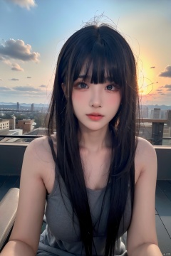NSFW,Frontal photography,Look front,evening,dark clouds,the setting sun,On the city rooftop,A 20 year old female,Black top,Black Leggings,black hair,long hair, dark theme, muted tones, pastel colors, high contrast, (natural skin texture, A dim light, high clarity) ((sky background))((Facial highlights)), Light master, 1girl