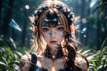 1 girl, normal chest, look at viewer, face portrait, elf, short elf ear, silky skin,surreal photography of a stunningly beautiful, blonde hair, blue eyes, intricate detailed, glowing, highly detailed, masterpiece, light particle, colourful light particles, concept art, 8 k,1girl navia, perfect split lighting