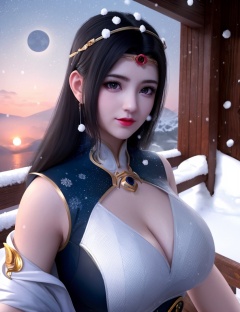 <lora:524-DA-大主宰-苏宣儿:0.8>(,1girl, ,best quality, ),looking at viewer,masterpiece, (( , )),, realistic,science fiction,mole, ultra realistic 8k cg, , ,outdoors, snow, snowing, snow on head, sun,sunset,sunlight,moonlight,full moon, red moon, crescent moon, crescent rose, black rose, (cleavage), (),