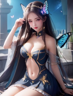 <lora:525-DA-斗破苍穹-萧薰儿-V2:0.8>(,1girl, ,best quality, ),looking at viewer, ,ultra detailed background,ultra detailed background,ultra realistic 8k cg, ,masterpiece, (( , )),, fiction,mole, , , ,, 1girl,butterfly sitting, night, star_\(sky\)(cleavage), age), (),