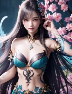 <lora:525-DA-斗破苍穹-萧薰儿-V2:0.8>(,1girl, ,best quality, ),looking at viewer, ,,ultra detailed background,ultra detailed background,ultra realistic 8k cg,, ,masterpiece, (( , )),ultra realistic 8k cgSurrounded by strange, movie perspective, advertising style, Colorful background, splash of color A beautiful woman with delicate facial features,tattoo all over body, flower arms, age), (),