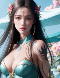 <lora:525-DA-斗破苍穹-萧薰儿-V2:0.8>(,1girl, ,best quality, ),looking at viewer, ,,ultra detailed background,ultra detailed background,ultra realistic 8k cg,, ,masterpiece, (( , )),ultra realistic 8k cgSurrounded by strange, movie perspective, advertising style, Colorful background, splash of color A beautiful woman with delicate facial features,tattoo all over body, flower arms, from below, age), (),