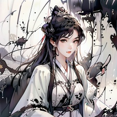 Ancient Art Style, Ink Painting, Traditional Chinese Painting, (Ink Style1:4), (Splash Ink Painting), 1girl, solo, long hair, smile, bangs, brown hair, black hair, hair ornament, long sleeves, dress, jewelry, upper body, ponytail, braid, earrings, outdoors, parted lips, necklace, cape, twin braids, fur trim, night, snow, lantern, snowing, winter,(Ink style)
