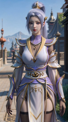 1girl, solo, thighhighs, ponytail, gloves, blue eyes, long hair, breasts, armor, hair ornament, black gloves, looking at viewer, standing, mischevious smile, perfect body, scenery, sharp focus, best quality, masterpiece, detailed outfit, illustration, perfect eyes, finely detailed beautiful anime eyes, realistic skin, intricate details, best lighting, depth of field, ultra high resolution,cowboy_shot, dynamic pose, dynamic angle,