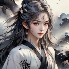 Ancient Art Style, Ink Painting, Traditional Chinese Painting, (Ink Style 1:4), (Splash Ink Painting), 1girl, solo, long hair, looking at viewer, hair ornament, dress, jewelry, closed mouth, upper body, grey hair, earrings, from side, chinese clothes, hair stick,(Ink style),Hazy