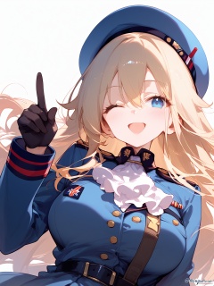 1girl, score_9, score_8_up, score_7_up, open mouth, military, military uniform, black gloves, upper body, blonde hair, blue jacket, jacket, hat, looking at viewer, ;d, smile, beret, large breasts, one eye closed, index finger raised, blue eyes, finger to mouth, gloves, military hat, simple background, white background, long sleeves, ascot, white ascot, hair between eyes, uniform, breasts, twitter username, dated, blue headwear, solo, long hair, white headwear, hand up, blush