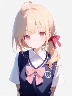 1girl, score_9, score_8_up, score_7_up, eyelashes, simple background, pink bow, pink bowtie, looking at viewer, sweater vest, tareme, red ribbon, wing collar, head tilt, sidelocks, vest, blush, bowtie, closed mouth, ribbon, school uniform, hair ribbon, short sleeves, arms behind back, blonde hair, white shirt, ponytail, black vest, ahoge, upper body, pink eyes, blunt bangs, collared shirt, eyebrows, long hair, solo, shirt, white background, bow, smile