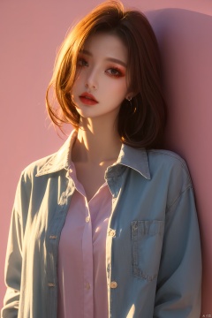 1girl,collared shirt,wall,afterglow,Sunset,eye-shadow
