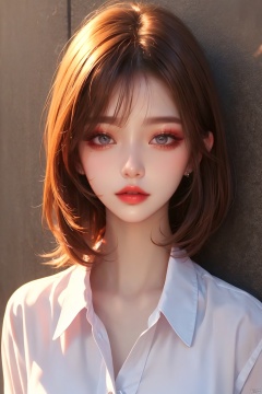 1girl,collared shirt,wall,afterglow,Sunset,eye-shadow