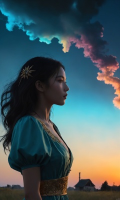 1girl, (from side), (silhouette:1.2), profile, big hair, masterpiece, best quality, light particle, depth of field, field, scenery, fantasy, indigo light, (far away:1.1), cute girl, midriff, tribal sash, pastel colors, chromatic aberration, glow in the dark dark, cloudy sky, space, orange aura, aura, cinematic, dark atmosphere, night , dark hole, glowing eyes, teal light, illumination, light rays, eye in the sky, (grass:0.9), falling petals, oniric portrait of a tall cloaked figure with a white mask, Azem the Traveler, yearning to explore the ends of the world to discover its wonders and help its denizens, by Andy Kehoe, a gradient masterpiece, blue cyan yellow, Rococopunk, luminism, seamless, China ink, Ink Bubbles, Gold leaf lines, alcohol ink elements, curved lines, cinematic, realism, chiaroscuro, Shadow play, Gold leaf small lines, bright splashes of alcohol ink puddles, volumetric light, auras, rays of sunlight, bright colors reflect, isometric, digital art, smog, pollution, toxic waste, chimneys and railroads, 3d render, octane render, volumetrics, by greg rutkowski, anime style