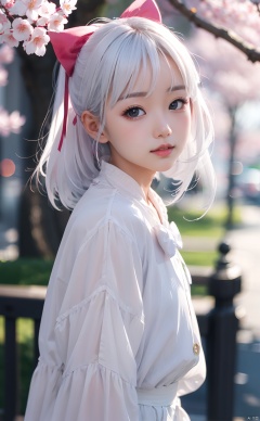 masterpiece,8k,best quality,(1girl),solo,kawaii,((depth of field)),bowknot,sakura,white hair