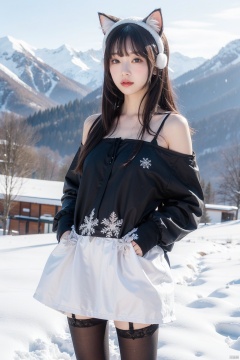 1 girl, Bangs,Black silk stockings,lace,dress,outdoor,snow mountain,snowflake,cat ear headdress