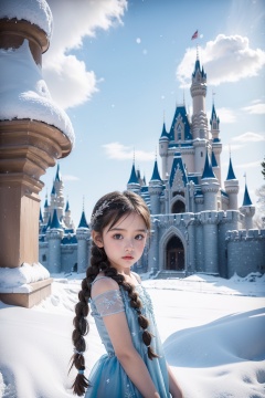 (5 year old girl:1.3),braid,elsa (frozen),(behind him is a huge castle:1.2),dress,solo,snow,blue dress,castle,twin braids,winter,outdoors,cloud,tree,long hair,blue eyes,full body,standing,brown hair,looking at viewer,cloudy sky,snowflakes,building,sky,bare shoulders,hair over shoulder,long dress,<lora:AISHA_20240414192804-000002:0.8>,