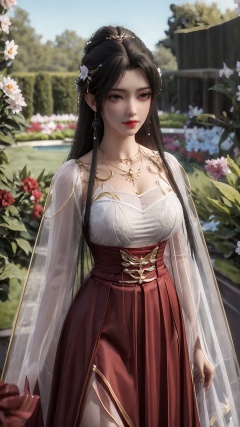 a girl,<lora:hmai_20240410212515:0.8>,dream garden,upper_body,macro range,red skirt,period dress,