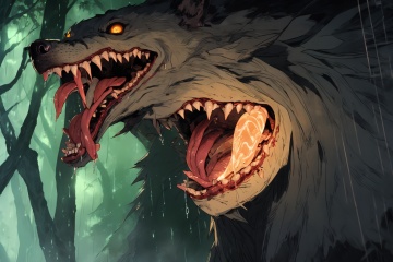 (masterpiece:1.2),best quality,highres,extremely detailed CG,no humans,tongue,teeth,sharp teeth,open mouth,forest,nature,tongue out,monster,dog,from side,glowing,glowing eyes,fangs,rain,animal,tree,solo,yellow eyes,<lora:FF_20240416081553-000007:1>,