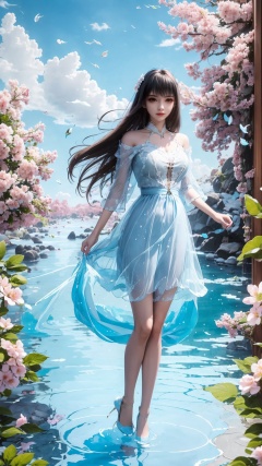 a girl,<lora:hmai_20240411014304:0.8>,above the knee,appear on camera,blue sky,full body,grand scene,light blue dress and translucency,