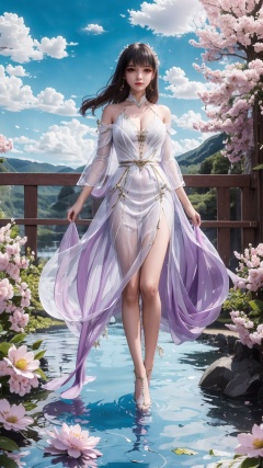 a girl,<lora:hmai_20240411014304:0.8>,appear on camera,blue sky,blue sky,white cloud,full body,red dress,