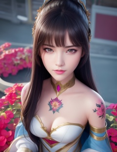 <lora:528-DA-万古狂帝-林柔:0.8>(,1girl, ,best quality, ),looking at viewer,  ,,ultra detailed background,ultra detailed background,ultra realistic 8k cg,, ,masterpiece, (( , )),ultra realistic 8k cgSurrounded by strange, movie perspective, advertising style, Colorful background, splash of color A beautiful woman with delicate facial features,tattoo all over body, flower arms,from above,