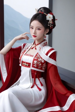 Portrait of noble and graceful goddess, dressed in red and white, elaborate coiffure hairstyle, dark hair, decoration, hourglass figure, transparent shawl,