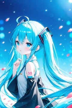 (masterpiece),(best quality),loli,1girl,solo,twintails,long hair,hatsune miku,detached sleeves,shirt,necktie,bangs,looking at viewer,sleeveless,sleeveless shirt,upper body,hair between eyes,blue eyes,blush,petals,very long hair,collared shirt,long sleeves,blue hair,bare shoulders,hair ornament,parted lips,black sleeves,blurry,looking to the side,wide sleeves,hand up,ahoge,from side,blurry background,tattoo,grey shirt,white shirt,blue necktie,