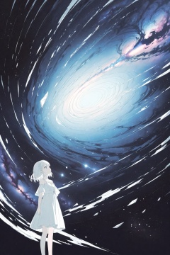 (silver, glimmer)),contrast,phenomenal aesthetic,best quality,sumptuous artwork,(masterpiece),(best quality),(ultra-detailed),(((illustration))),((an extremely delicate and beautiful)),(detailed light),cold theme,broken glass,broken wall,((an array of stars)),((starry sky)),the Milky Way,star,Reflecting the starry water surface,(1girl:1.3),awhite hair,blinking,white dress,closed mouth,constel lation,flat color,white hair,braid,blinking,white robe,barefoot,float,flat color,looking up,standing,medium hair,standing,solo,space,universe,Nebula,many stars,fanxing,