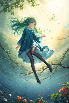 (masterpiece),(best quality),illustration,ultra detailed,hdr,Depth of field,(colorful),1girl,mint hair,orange eyes,clover hair ornament,long hair,disheveled hair,messy hair,plum blossoms,blue pajamas,branch,dragonfly,full body,mismatched legwear,white legwear,black legwear,pantyhose,xinniang,backlight,black pantyhose,white pantyhose,vibrantProj,