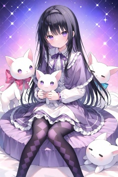 masterpiece,best quality,high quality,(colorful),Artist onineko,1girl,loli,akemi homura,sitting,long hair,pantyhose,black hair,purple eyes,hairband,kyubey,long sleeves,skirt,looking at viewer,argyle legwear,bangs,capelet,black pantyhose,frills,closed mouth,feet out of frame,black hairband,frilled skirt,ribbon,magical girl,:3,shirt,argyle,creature,knees together feet apart,neck ribbon,expressionless,on lap,white shirt,solo,