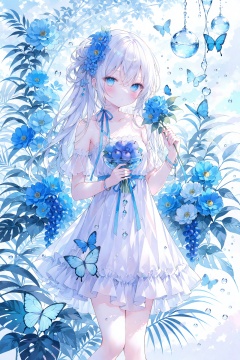 masterpiece,best quality,high quality,(colorful),Artist onineko,1girl,loli,flower,solo,hair ornament,dress,bug,butterfly,blue eyes,hair flower,long hair,holding,looking at viewer,blue flower,white dress,blue butterfly,bare shoulders,food,fruit,hair between eyes,strapless dress,strapless,jewelry,collarbone,white hair,blush,ribbon,standing,plant,closed mouth,bracelet,water drop,blue ribbon,leaf,