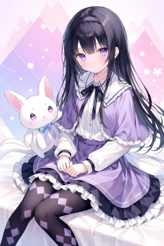 masterpiece,best quality,high quality,(colorful),Artist onineko,1girl,loli,akemi homura,sitting,long hair,pantyhose,black hair,purple eyes,hairband,kyubey,long sleeves,skirt,looking at viewer,argyle legwear,bangs,capelet,black pantyhose,frills,closed mouth,feet out of frame,black hairband,frilled skirt,ribbon,magical girl,:3,shirt,argyle,creature,knees together feet apart,neck ribbon,expressionless,on lap,white shirt,solo,
